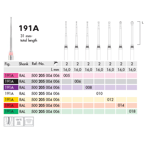 Hårdmetal rosenbor med ekstra lang, slank hals til fx lokalisering af kanalindgange ved rodbehandling samt nedboring ved knækket stift for at løsne denne, til RA, L 31 mm, str. 010, hvid, hoved & halslængde 16 mm.