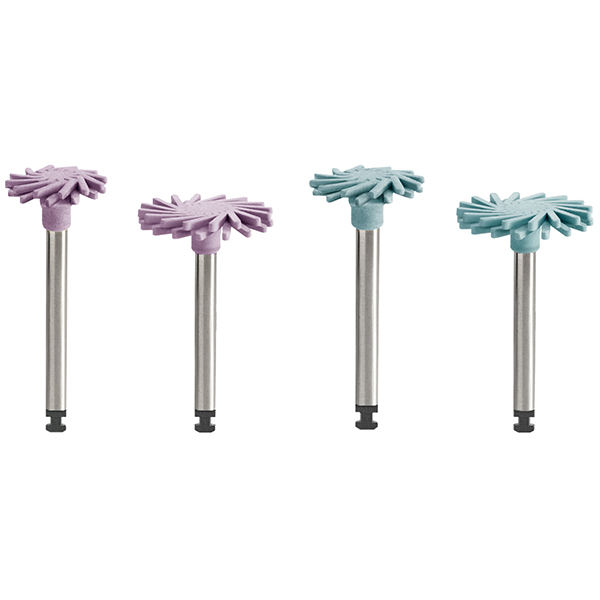 Spiralhjul til polering af restaureringer efter brug af diamanter, til RA, sæt til komposit med Step 1 lilla i str. 110 og 140 og Step 2 blå i str. 110 og 140.