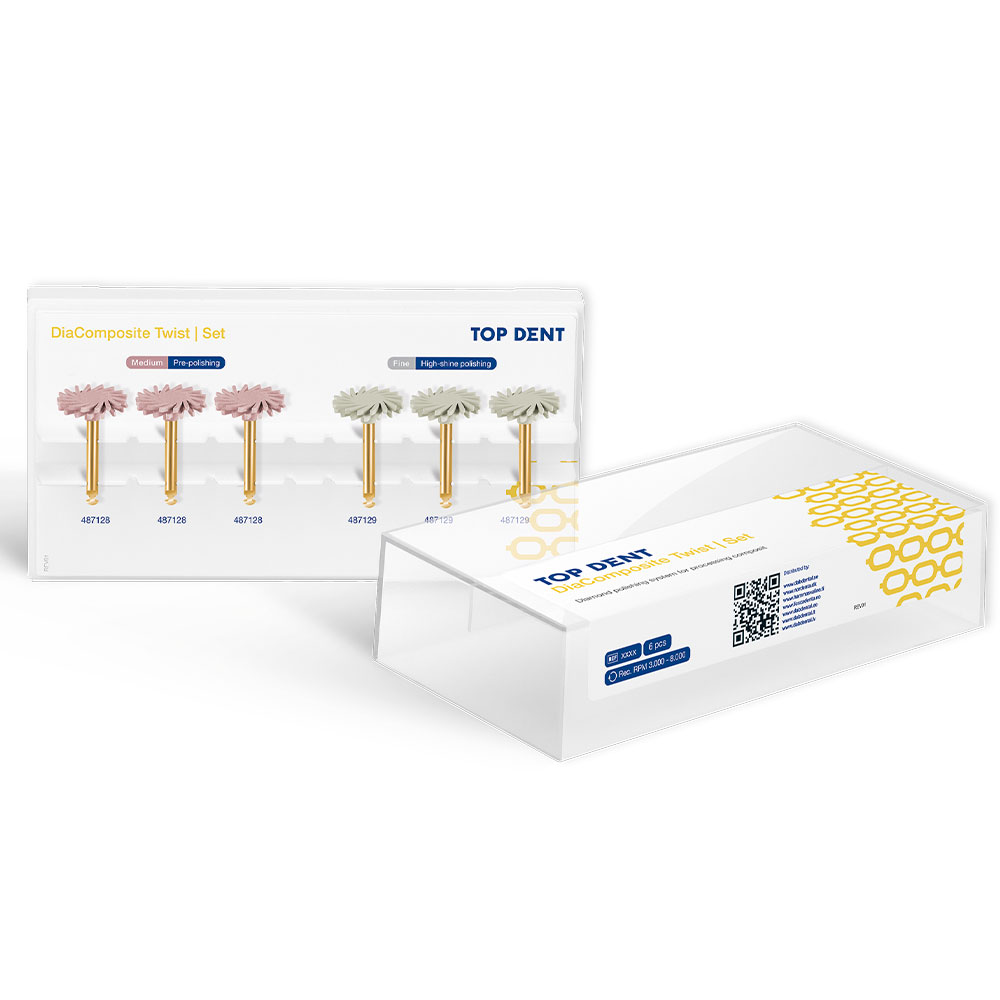 Silikonepolerere til komposit, imprægneret med diamantpartikler, monteret til RA, Twist poleringshjul, diamater 14 mm, pink til forpolering og grå til højglanspolering, kan autoklaveres og genbruges, sæt med 3 pink og 3 grå polerere.