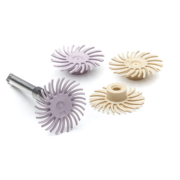 2-step poleringssystem med spiral-hjul til anvendelse på komposit-restaureringer. Forpoleringsspiralen (beige) udglatter og fjerner ujævnheder opstået under kontureringen, og diamant poleringsspiralen (rosa) giver højglanspolering. Begge typer spiraler kan autoklaveres og bruges flere gange.