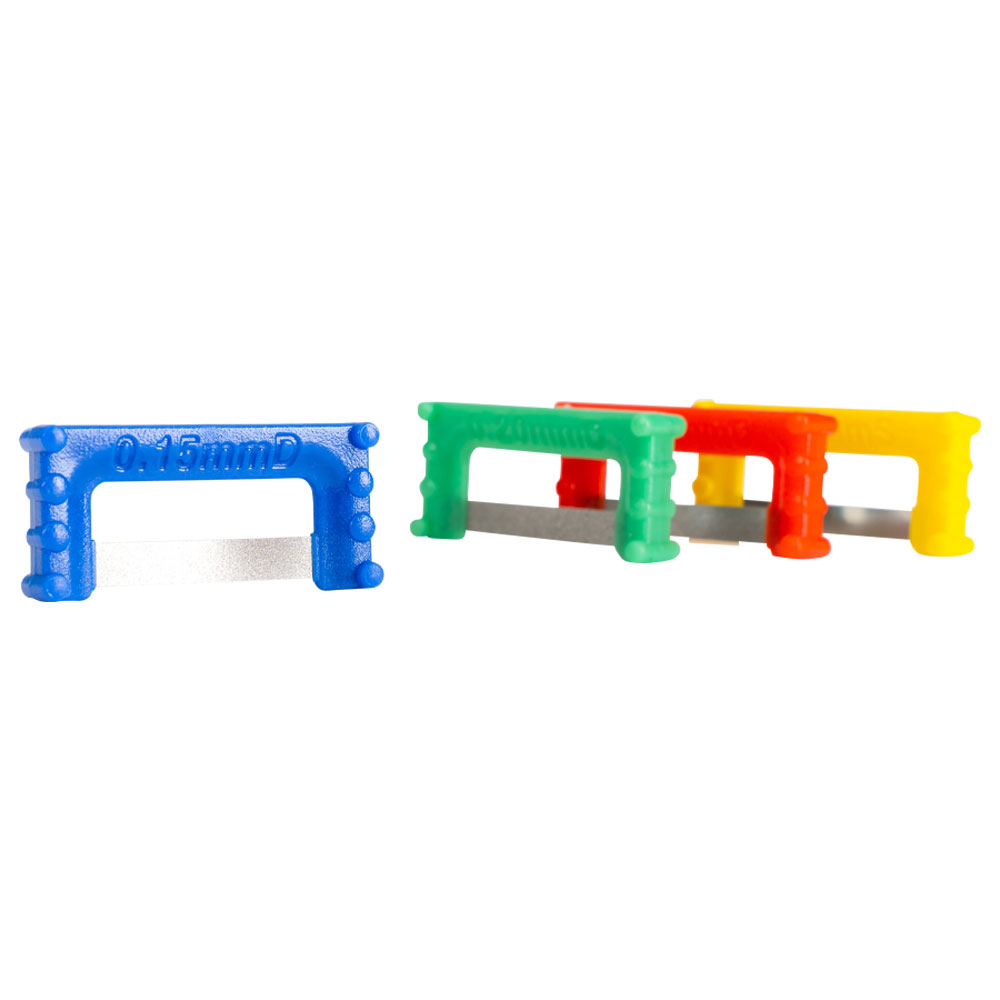 System af håndholdte diamantstrips til approximal emaljereduktion ved diverse ortodontiske behandlinger, fleksible og bøjelige, tilpasser sig tandens naturlige konturer/form, kan anvendes approximalt i hele munden, tåler opvaskemaskine og autoklave- ring ved 134 grader, lille startsæt med 2 gule (starter), 2 røde (opener), 2 blå (udvider) og 2 grønne (x-udvider) strips.