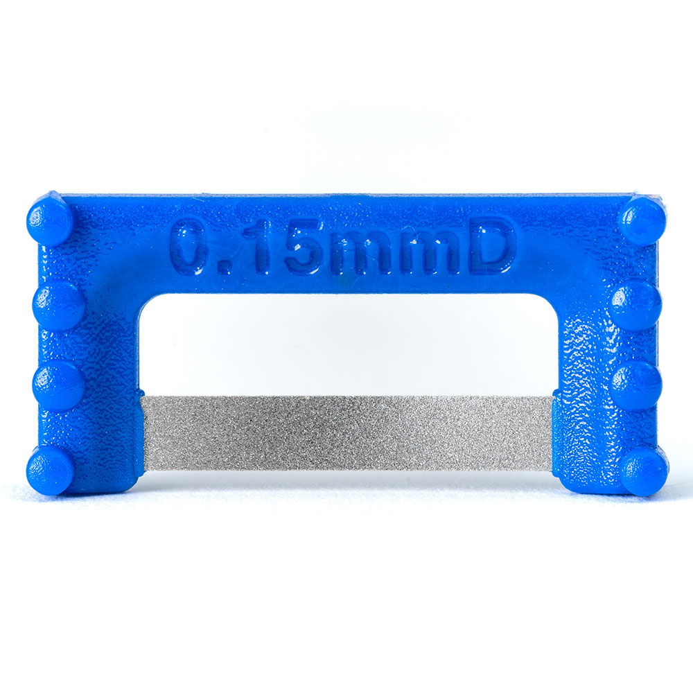 System af håndholdte diamantstrips til approximal emaljereduktion ved diverse ortodontiske behandlinger, fleksible og bøjelige, tilpasser sig tandens naturlige konturer/form, kan anvendes approximalt i hele munden, tåler opvaskemaskine og autoklave- ring ved 134 grader, strips med blåt håndtag, Udvider, dobbeltsidet/grov, tykkelse 0,15 mm, højde 4 mm, refill.