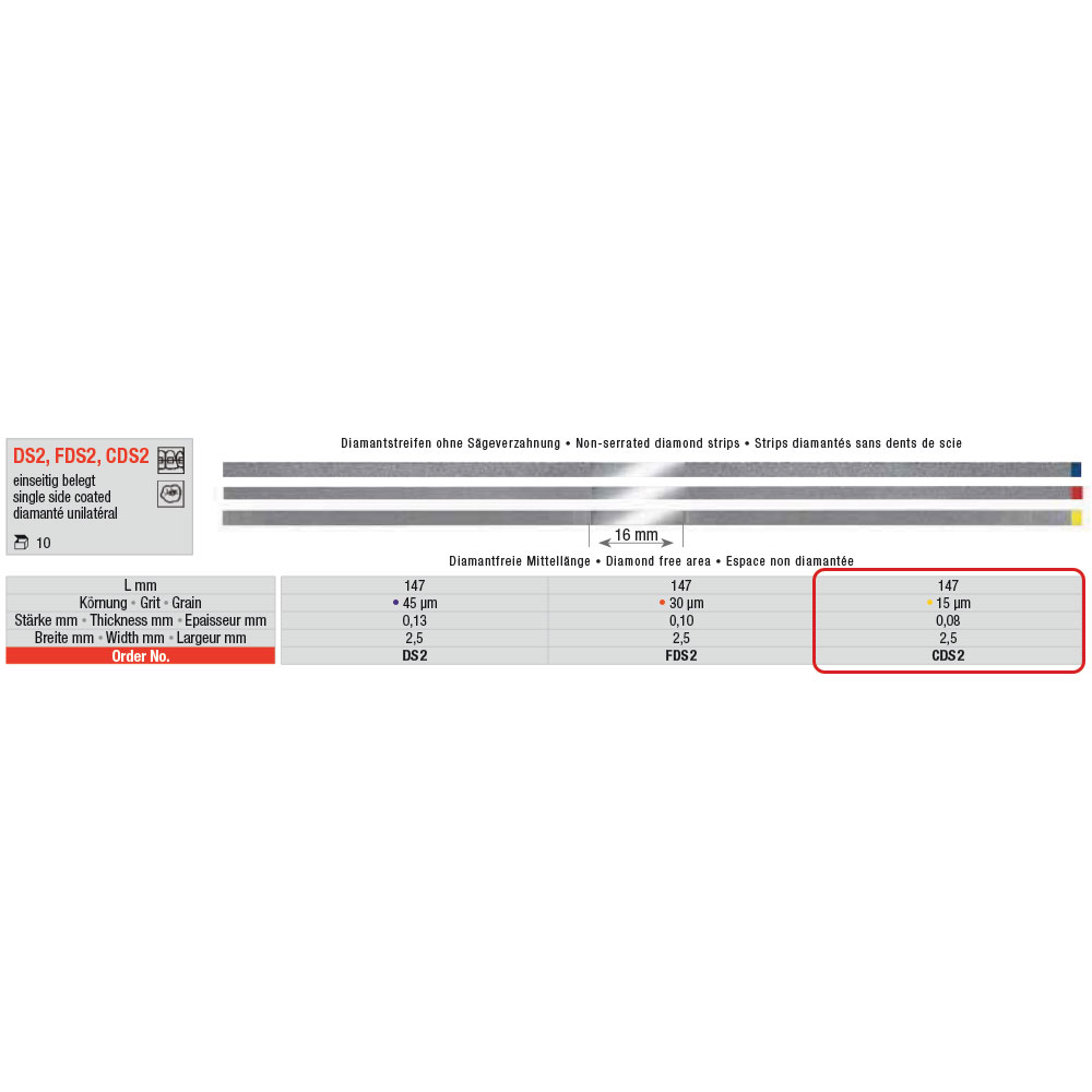 Diamant pudsestrips, enkeltslibende (ensidet), bredde 2,50 mm , længde 147 mm, med midterstykke uden diamantbelægning (16 mm), ekstrafin gul, (15 my i kornstørrelse), tykkelse 0,08 mm,CDS2.