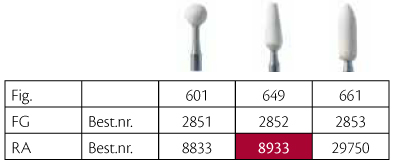 Slibesten til komposit, til RA, nr. 649, XF ekstra fin, hvid, konisk med flad top, str. 025. Omdrejninger max 160.000/min.