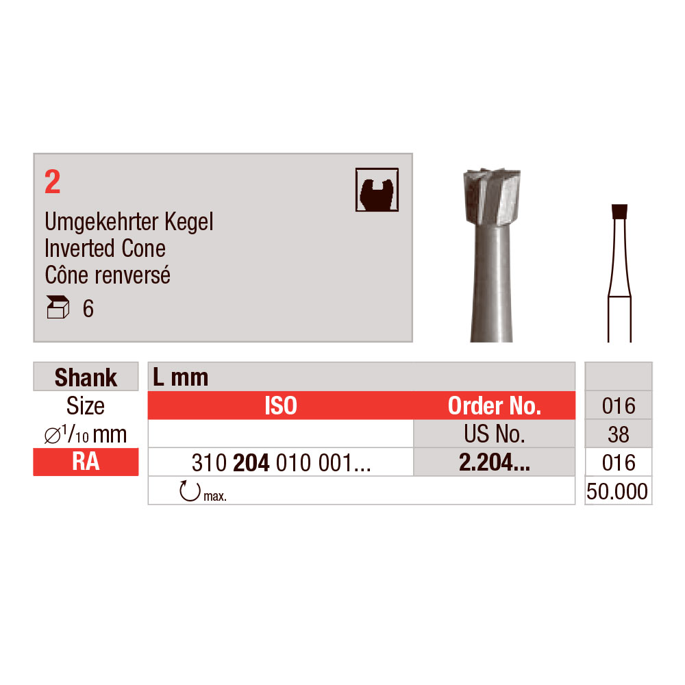 Stålbor til præparation, omvendt kegle, str. 016, til RA.