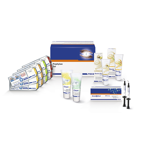 Sæt med profylakseprodukter fra Voco bestående af Clean Joy pudsepasta, Remin Pro og Remin Pro forte pasta, Profluorid lak samt Grandio Seal fissurforsegling.