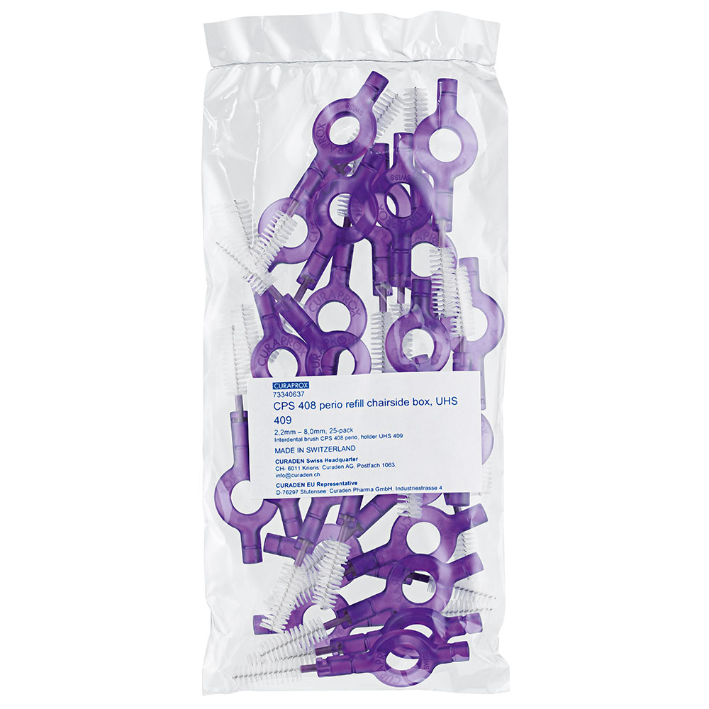 Interdentalbørster, Perio, CPS 408S med kort skaft, lilla, cylindriske 2,2/8,0 mm. Chairside refill med UHS 409 handy plastskafter.
