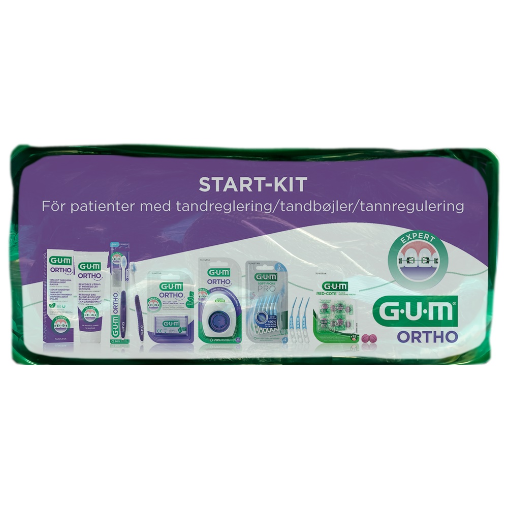 Sæt med 12 ml Ortho tandpasta, 1 Ortho tandbørste, 1 pakke Ortho voks, Ortho floss (5 tråde), 1 stk. Soft-Picks Pro Small samt 2 stk. Red-Cote indfarvningstabletter.