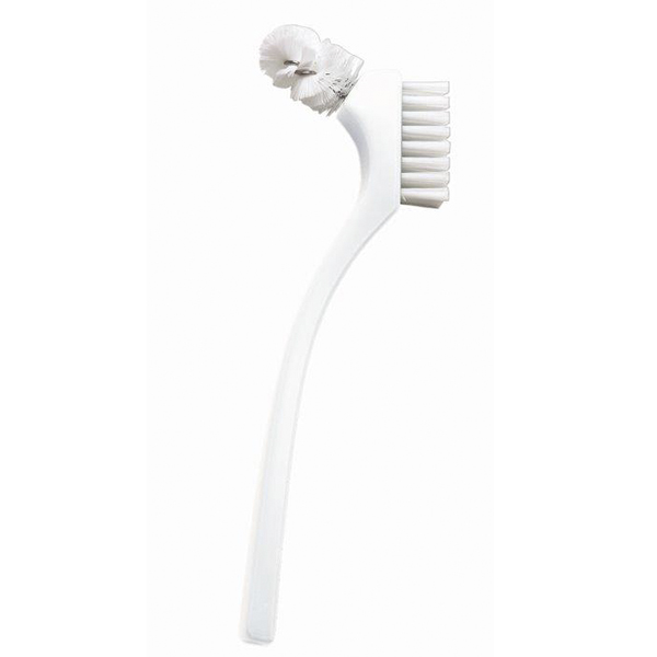 Curaprox BDC150 protesebørste, med spiralformet børste foroven og et kraftigt børstehoved i siden, hvid, cellofon-indpakkede.