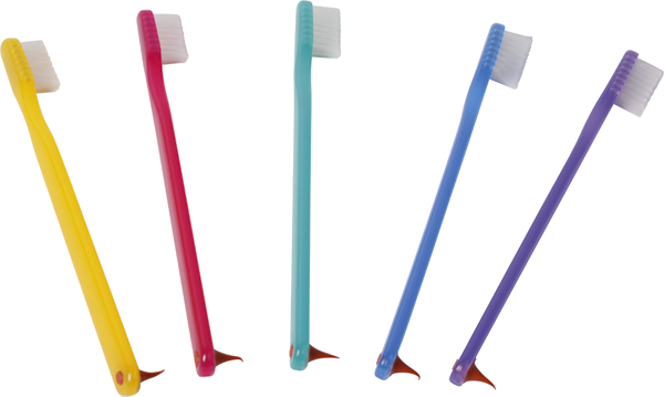 Tandbørster, nr. 409, regular, blød, 4 rækker børstebundter, med kuppelformede børstehår i midten af børsten (Dome Trim) hvilket giver en mere effektiv fjernelse af plak og mindsker risikoen for tandkødsinflammationer, med stimulator i enden af skaftet.