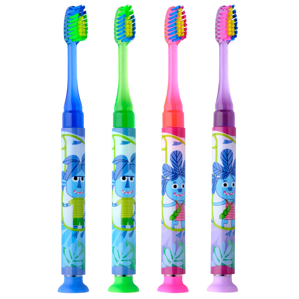 Tandbørster, nr. 903, junior, blød, 4 rækker børstebundter, LIGHT-UP med 1 minuts timer/lys, der blinker i 1 minut efter aktivering, med sugekop på enden af skaftet, så den kan stå, i blisterpakninger.