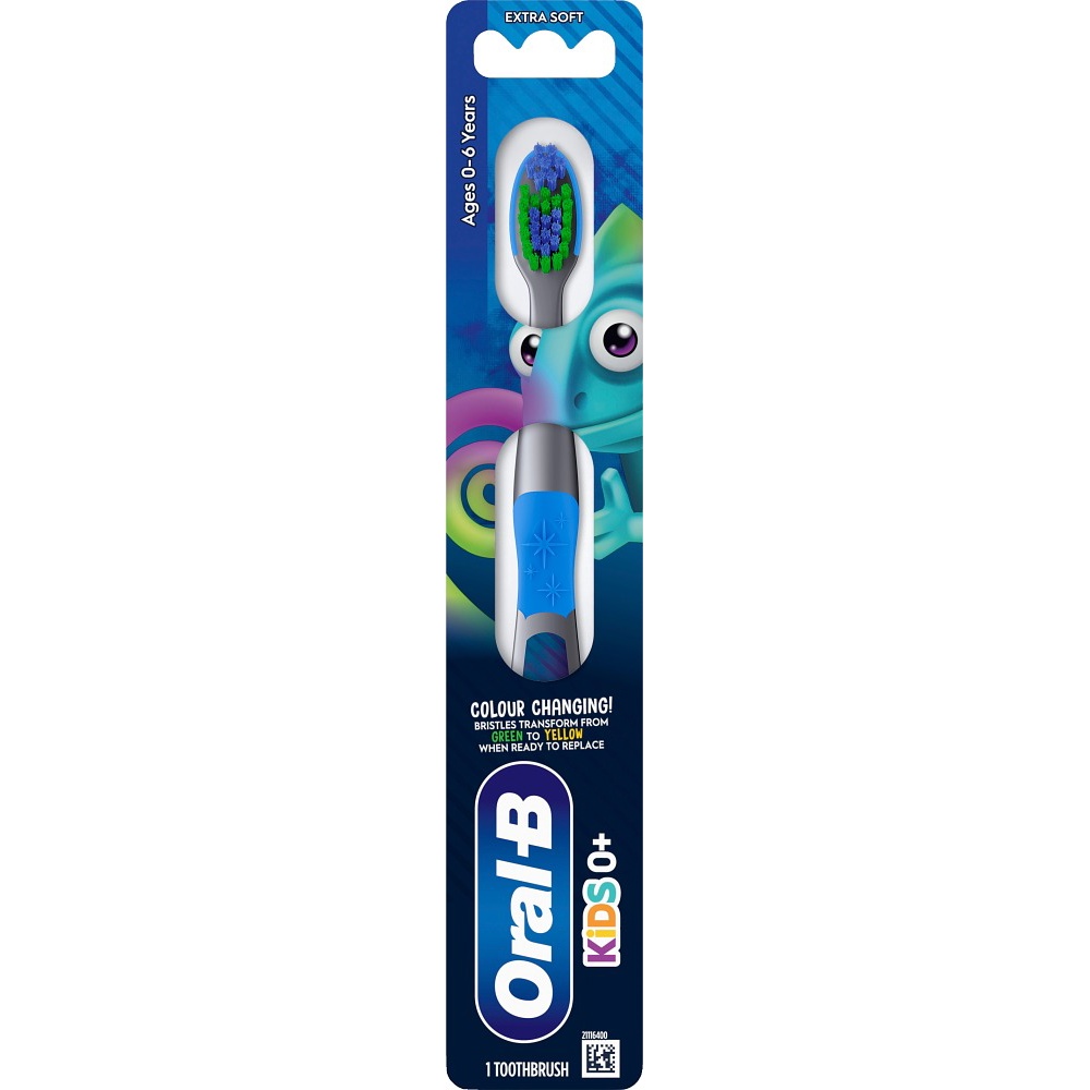 Tandbørster, Kids 0-6 år, X-blød, med ekstra bløde børstehår med farvede børstehår, der skifter farve, når børsten skal skiftes, og et mindre, polstret børstehoved, der beskytter tandkødet. Med integreret tungerenser og kraftigt greb med gummibelægning og billede på skaftet.