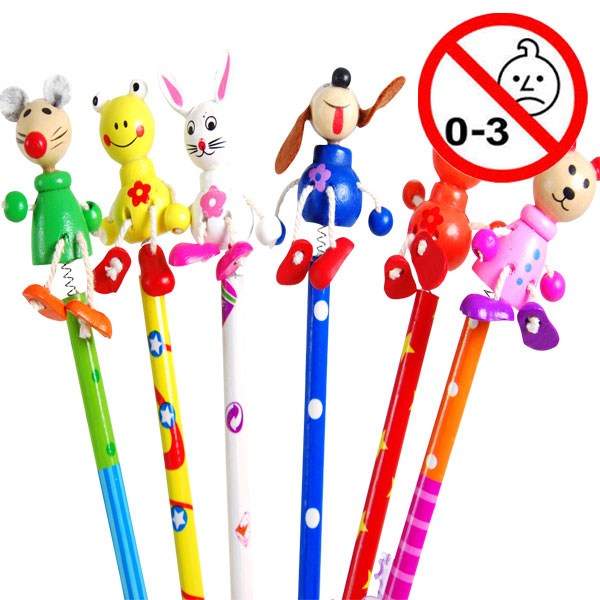 Blyanter i stærke farver med mønster og med forskellige retro dyr i håndmalet træ på toppen, sidder på en fjeder så den gynger når man skriver med blyanten.