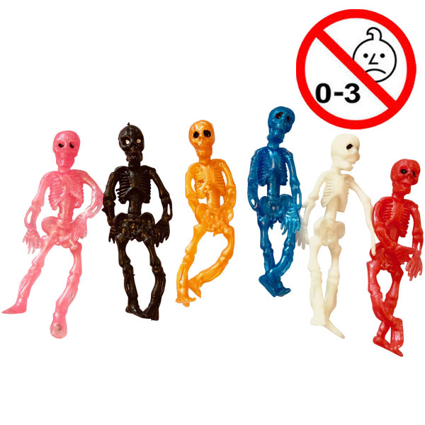 Skelet-figurer i blød og elastisk plast, længde 6,5 cm, i assorterede farver. Ikke egnet til børn under 3 år.