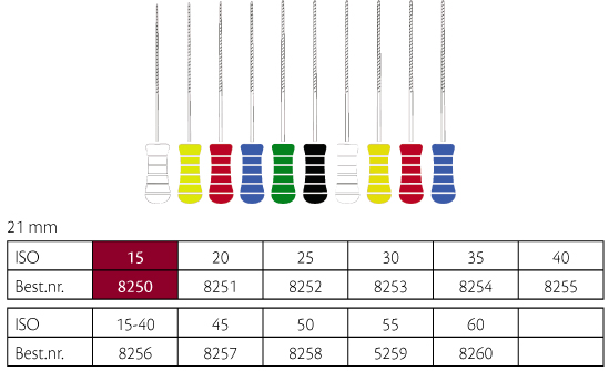 K-File NiTiflex file, nikkeltitanium med større flexibilitet, ref. A012N, farvekodede plastgreb, 21 mm, nr. 15, hvid.