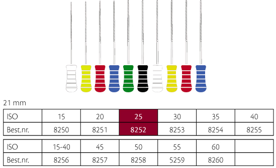 K-Flex NiTiflex file, nikkeltitanium med større flexibilitet, ref. A012N, farvekodede plastgreb, 21 mm, nr. 25, rød.