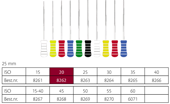 K-File NiTiflex file, nikkeltitanium med større flexibilitet, ref. A012N, farvekodede plastgreb, 25 mm, nr. 20, gul.