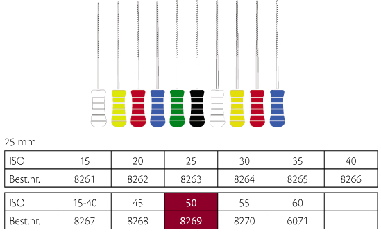 K-File NiTiflex file, nikkeltitanium med større flexibilitet, ref. A012N, farvekodede plastgreb, 25 mm, nr. 50, gul.