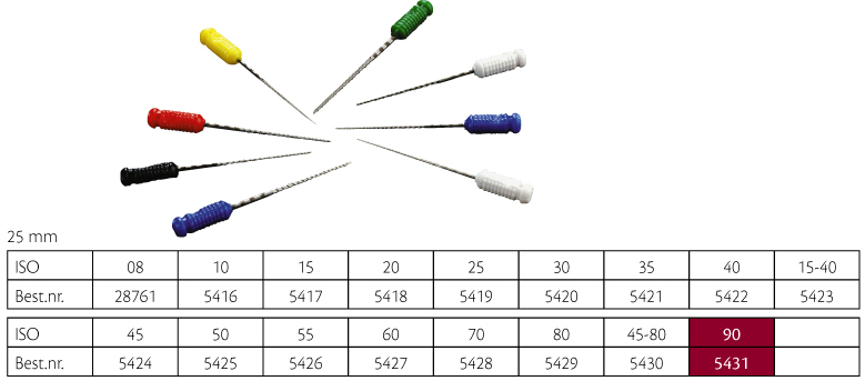 S-file, dobbeltskærende file med S-formet tværsnit og grebsvenligt skaft, 25 mm, nr. 90. Sterilt enkeltpakkede.