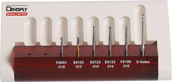 Sæt med 6 bor: 2 runde hårdmetalbor til FG i str. 010 og 014, 1 rund diamant til FG i str. 016, 1 transmetalbor til FG i str. 012, 1 X-Gate-bor (lille tip komb. m. stor max diameter) og 1 konisk diamantbor skærende på spidsen.