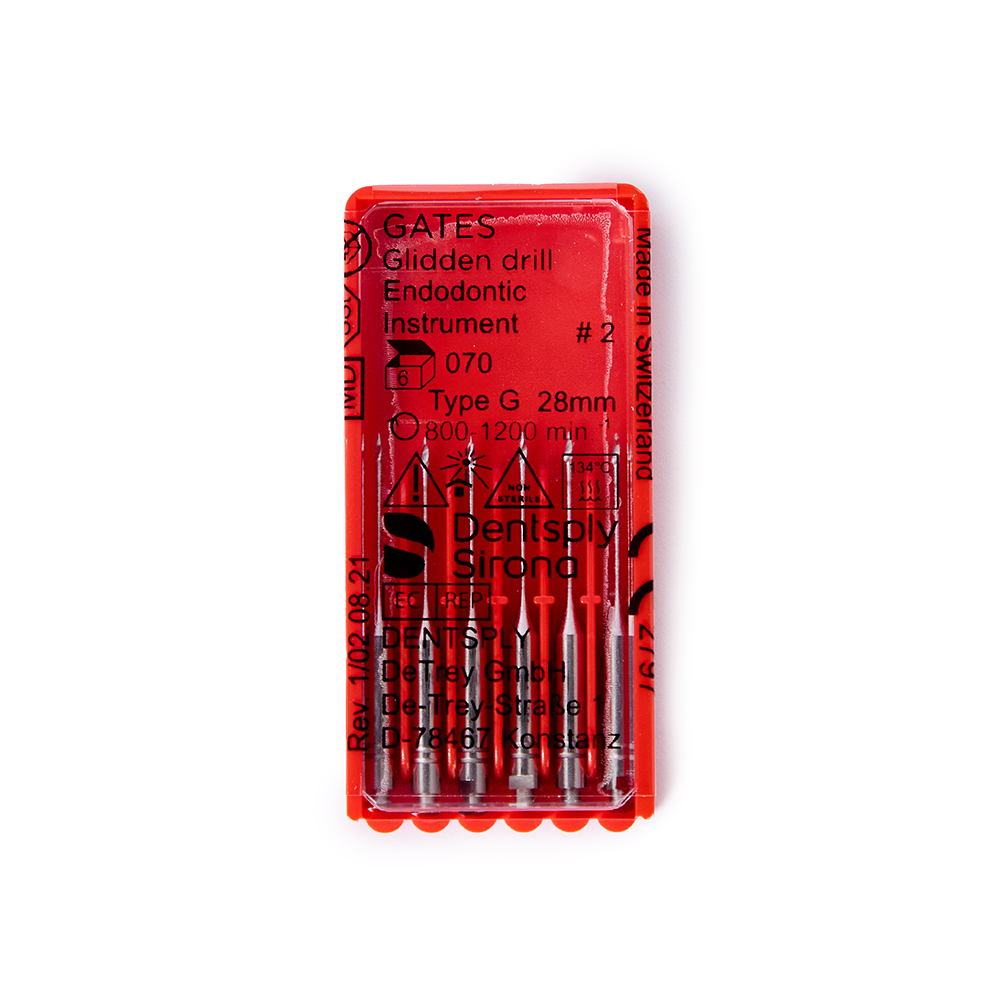 Gates Glidden bor, anvendes til åbning af rodkanalindgange og til crown-down præparationer af rodkanaler, til RA, kort, fuld længde af boret er 28 mm, hoved og hals er 15 mm. Nr. 2 Ø 0,7 mm.