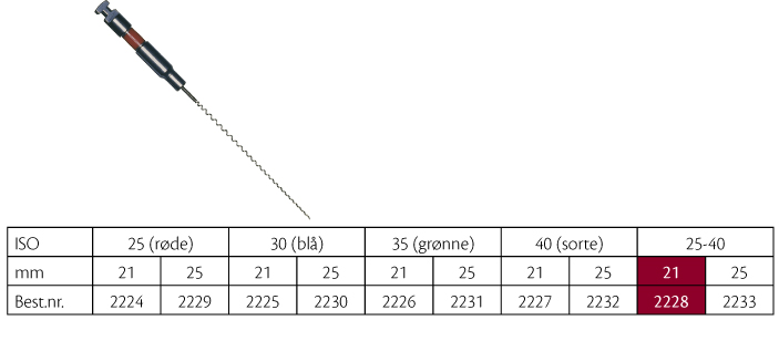 Rodfyldningsspiraler, fleksibel med fjeder-effekt tættest på skaftet, svarer til de tidligere rodspiraler fra VDW, metalskaft, 21 mm, nr. 25-40, assorteret.