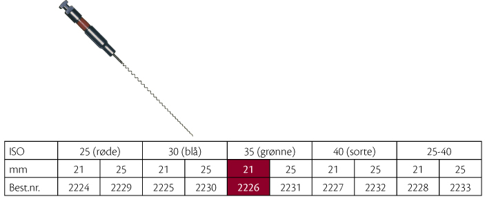 Rodfyldningsspiraler, fleksibel med fjeder-effekt tættest på skaftet, svarer til de tidligere rodspiraler fra VDW, metalskaft, 21 mm, nr. 35, grøn.