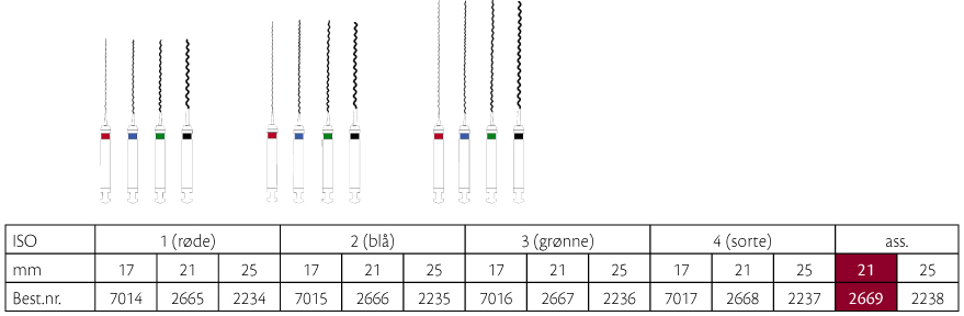 Rodfyldningsspiraler, Lentulo, ref. A0022, metalskaft, 21 mm, ass. nr. 1-4.