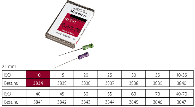 Udvidere, Kerr Reamers Hand Files, farvekodede plastgreb, 21 mm, nr. 10, lilla.