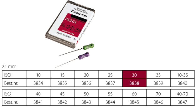Udvidere, Kerr Reamers Hand Files, farvekodede plastgreb, 21 mm, nr. 30, blå.