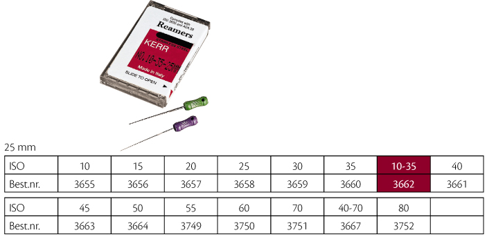 Udvidere, Kerr Reamers Hand Files, farvekodede plastgreb, 25 mm, ass. nr. 10-35.