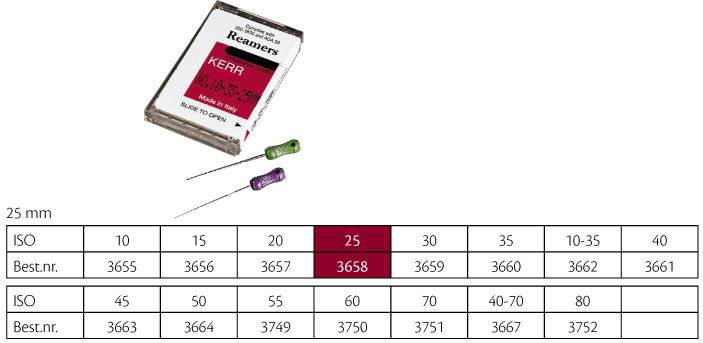 Udvidere, Kerr Reamers Hand Files, farvekodede plastgreb, 25 mm, nr. 25, rød.
