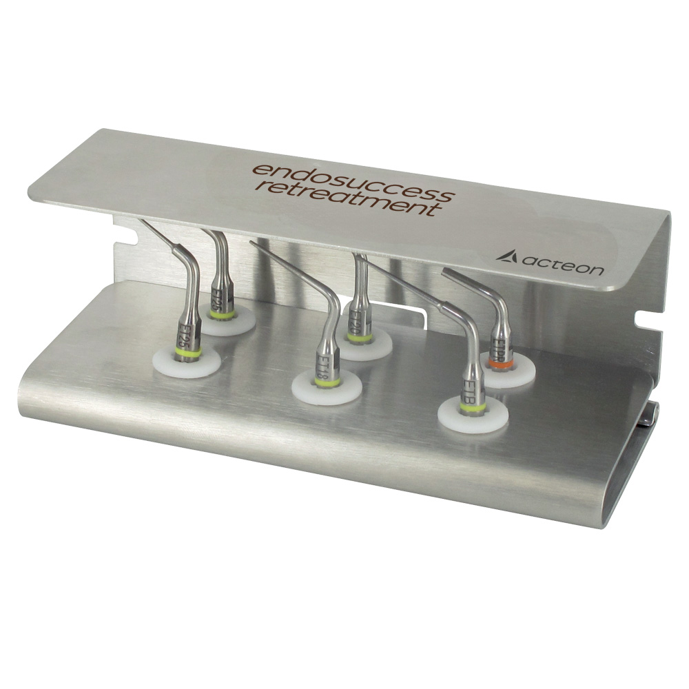 Sæt med 6 forskellige Endosuccess ultralydsspidser til endodontisk revision: ET18D Cavity access finishing tip med gul ring, ET20 Universal med gul ring, ET25 Ti-Nb tip med gul ring, ET25S Short Ti-Nb tip med gul ring, ETBD Exploration tip med gul ring og ETPR Loosening tip med rød ring.