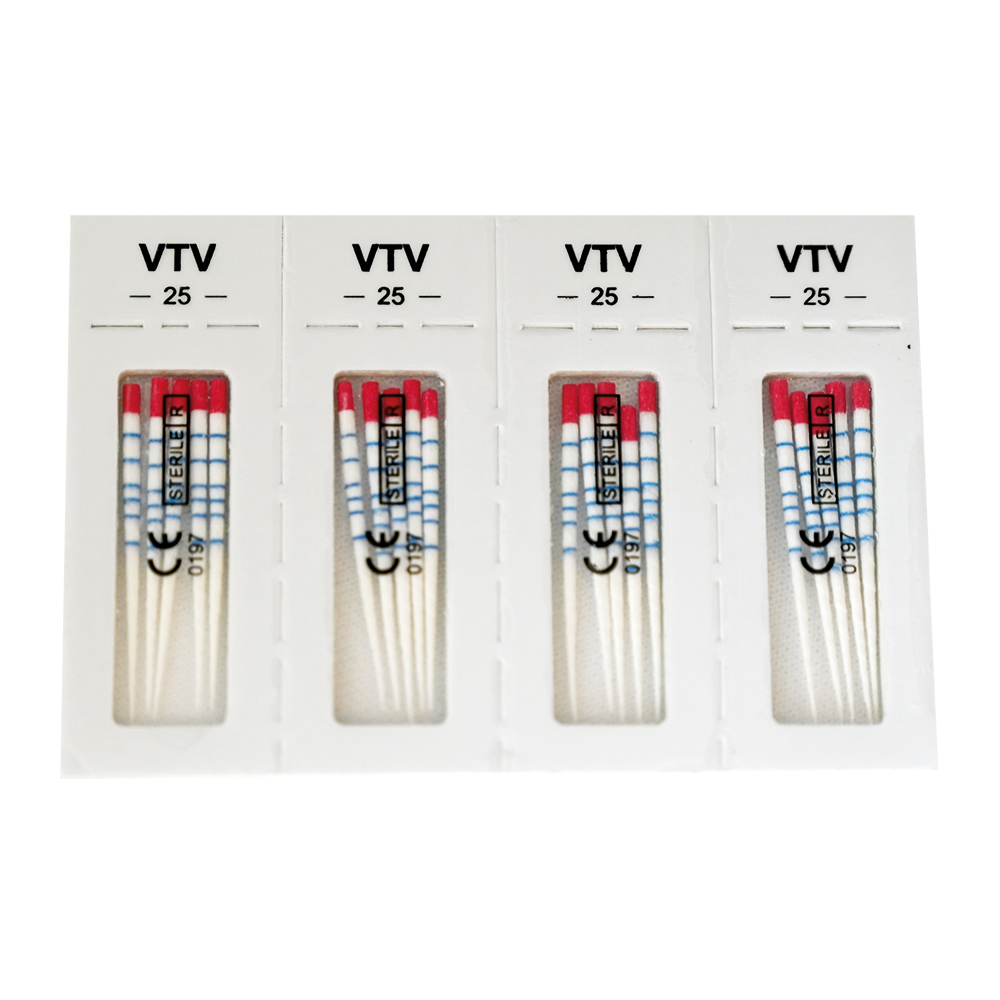 Paperpoints til Recipfile V & V Blue, har markering for 18, 20 og 22 mm og farvekodet top tilsvarende filene, 29 mm, R25 rød (25/.08). Sterilt cellepakket med 5 stk i hver celle.