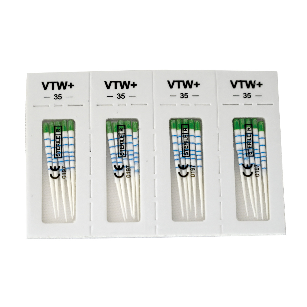 Sterile paperpoints til W+ Gold file, har markering for 18, 20 og 22 mm og farvekodet top tilsvarende filene, Medium grøn (35/.06). Pakket i blisterpakninger med 5 stk..