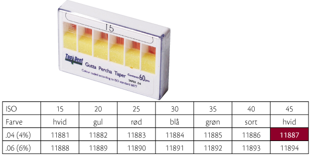 Guttaperkapoints, til rodfyldning hvor der er anvendt fx SystemGT, Profile, Protaper eller andre nikkeltitaniuminstrumenter, farvekodede i toppen, GT .04, 28 mm, nr. 45, hvid.