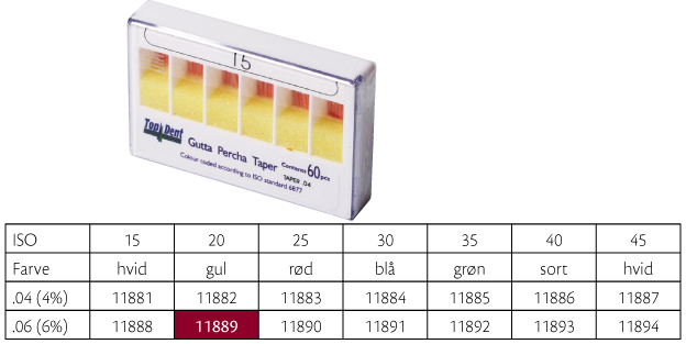 Guttaperkapoints, til rodfyldning hvor der er anvendt fx SystemGT, Profile, Protaper eller andre nikkeltitaniuminstrumenter, farvekodede i toppen, GT .06, 28 mm, nr. 20, gul.