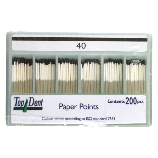 Paperpoints, farvekodede i toppen, 28 mm, nr. 40, sort. Er sterile indtil anbrud af pakken.
