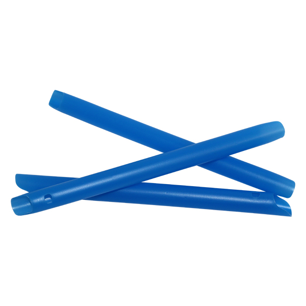 Sug til tykke sugeslanger, i blå plast, 14 cm, S-formet afskåret i begge ender, med ventilationshul i den ene ende, mellemblå farve.