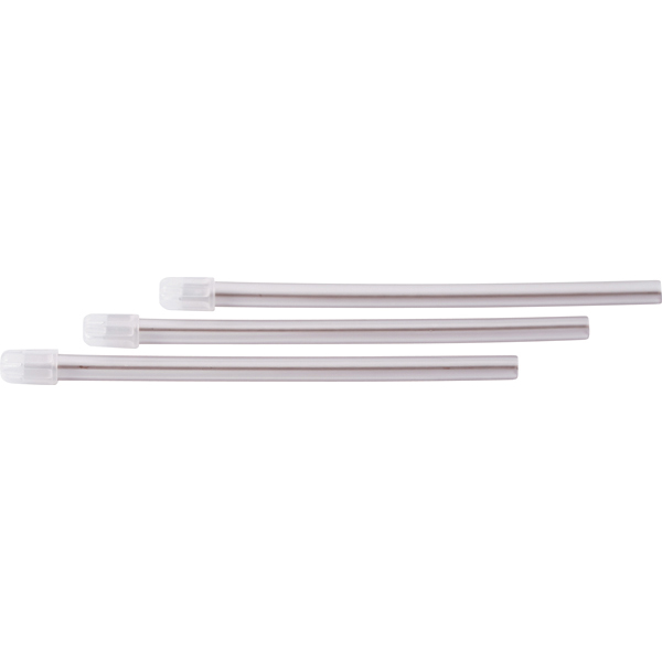 Spytsug til tynde sugeslanger i blød plast med bøjelig ståltråd og hætte, klare, hætterne er IKKE aftagelige, længde med hætte 12,5 cm.