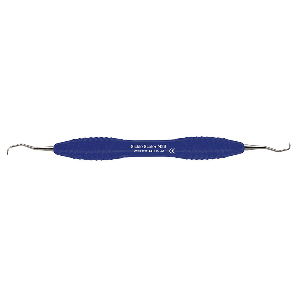 Scaler, 313-314, Sickle M23, med kortere arbejdende del og længere hals end Mini Sickle, S Sharp Swiss Steel som holder skarpheden 3-4 gange længere, men er uden coating så de stadig kan slibes, mørkleblå, E ergonomisk silikonegreb.
