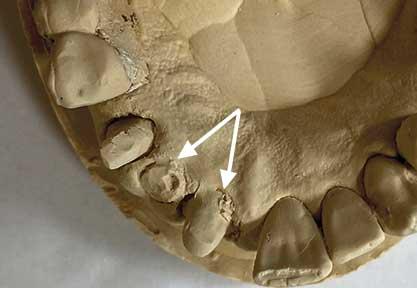 - Tjek aftryk for trækninger og ”blanke” præparationsgrænser (det blanke område opstår, hvis aftryksmaterialet ikke har været helt ”i bund” i pochen). Præparationsgrænsen skal kunne ses hele vejen rundt.