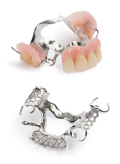 Delprotese med et støbt stel, også kaldet en unitor. Her er bøjlerne og en eventuel ganeplade fremstillet i støbt metal (som regel en blanding af krom og kobolt). Dette er hårdt metal med stor styrke. Det betyder, at man kan bruge metallet i ganske tynde lag og alligevel opnå en solid protese. Kan erstatte enkelte eller flere tænder.Den gode konventionelle partielle protese, som fastholdes af bøjler på resttandsættet.