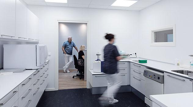 "Det var vigtigt for mig, at sterilisationen skulle være lettilgængelig - ikke kun fra behandlingsrummene, men også fra receptionen – og at man fra personalerummet havde let udsyn til receptionen ..."