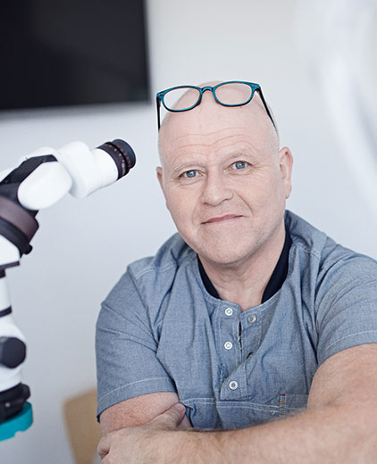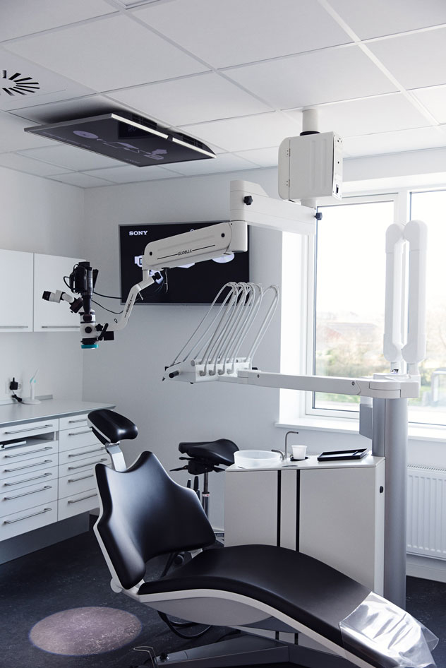Ved endodontiske behandlinger benyttes mikroskop og kofferdam, og ofte sandblæses der for at lokalisere oblitererede kanaler. Og når vi laver en kompositfyldning, så anvender vi kofferdam og sandblæser hullet, inden vi bonder og fylder kaviteten. Når det er lavet sådan, giver jeg gerne folk en garanti for, at det holder i hvert fald så længe, jeg lever,” fortæller tandlægen entusiastisk.